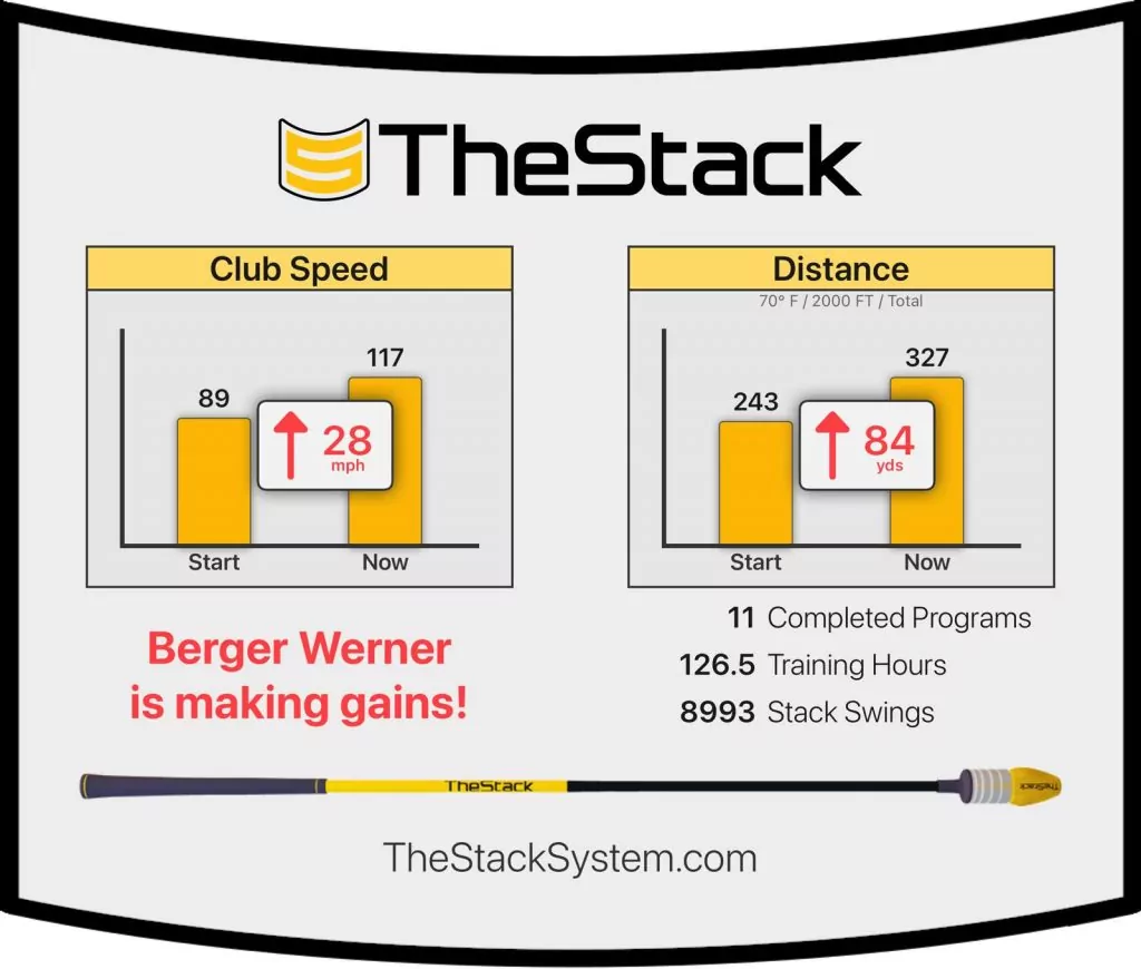 16 abgeschlossene Programme, über 180 Stunden Training und 10.000 dokumentierte Schwünge später halte ich nun die Gold Stack Weights in den Händen – die Auszeichnung für diesen Weg und ein Platz in der Hall of Fame von The Stack.